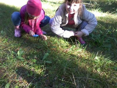 Zaopatrzone w lupy dzieci oglądały różne okazy przyrodnicze( liście,
