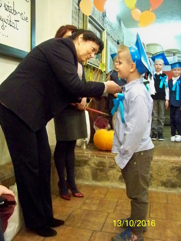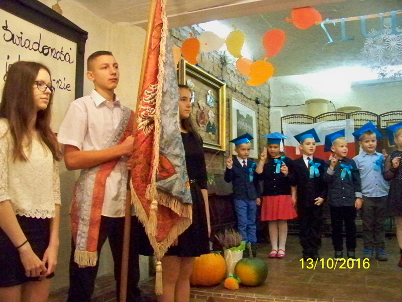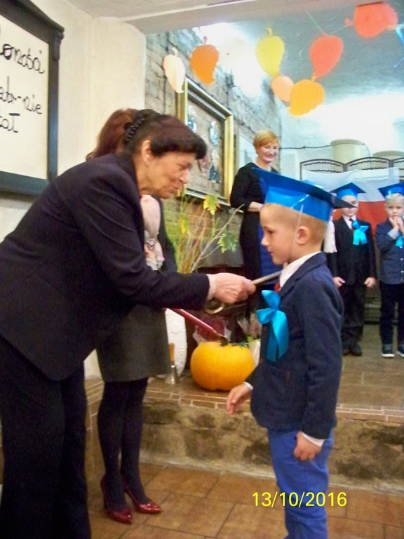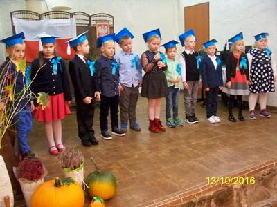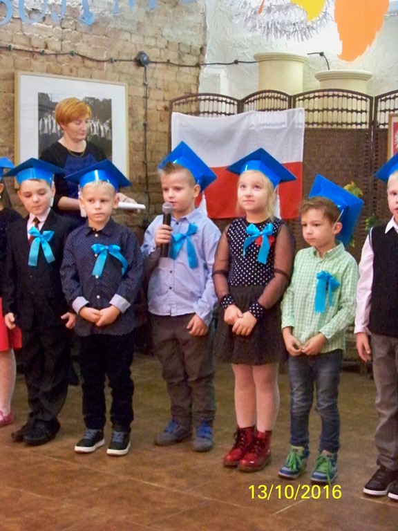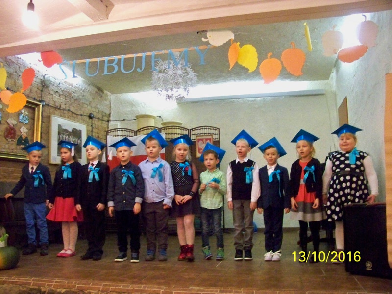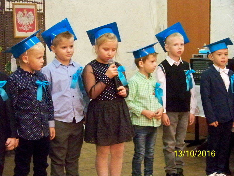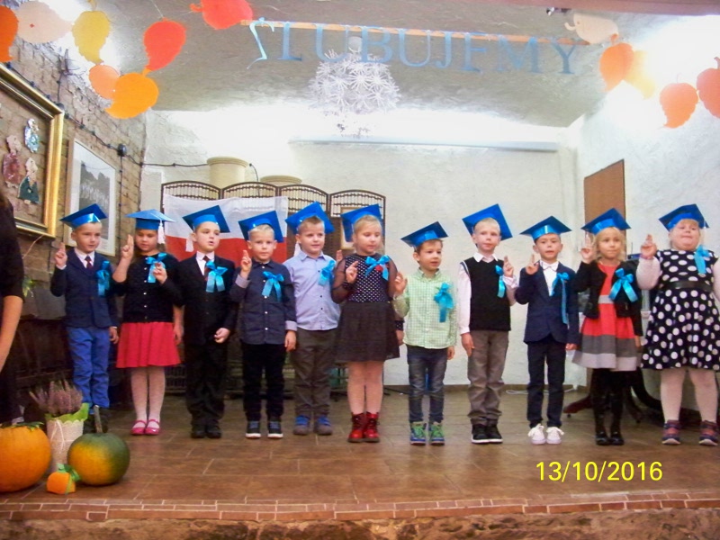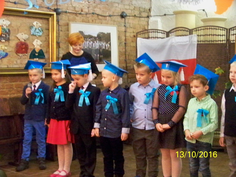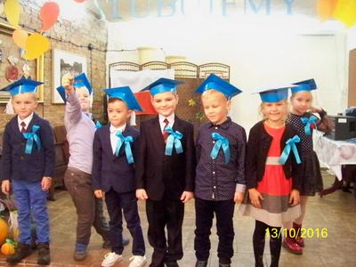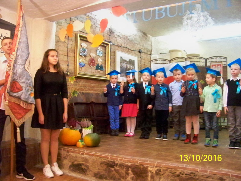 To był wyjątkowy dzień. Uroczystość przebiegała w podniosłej i uroczystej atmosferze, którą prowadziła wychowawczyni Anna Wasilewska. Bohaterowie dnia odświętnie ubrani, z uśmiechem na buzi, przedstawili zebranym gościom wspaniały program artystyczny, w którym udowodnili, że z „żółtodziobów” przeobrazili się w pierwszoklasistów i mogą być pasowani na ucznia. Najważniejszym punktem uroczystości było złożenie przysięgi przez pierwszoklasistów. Przyrzeczenie złożone na sztandar szkoły oficjalnie zakończyło okres próby i przypieczętowało przynależność uczniów do naszej szkoły. Po przyrzeczeniu pani dyrektor Ewa Thiemann i pani sekretarz Maria Palichleb uroczyście pasowali każdego pierwszoklasistę na ucznia. Na pamiątkę tego ważnego wydarzenia uczniowie otrzymali dyplomy oraz drobne upominki i udali się na słodki poczęstunek przygotowany przez rodziców.
