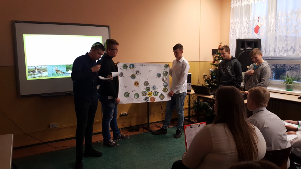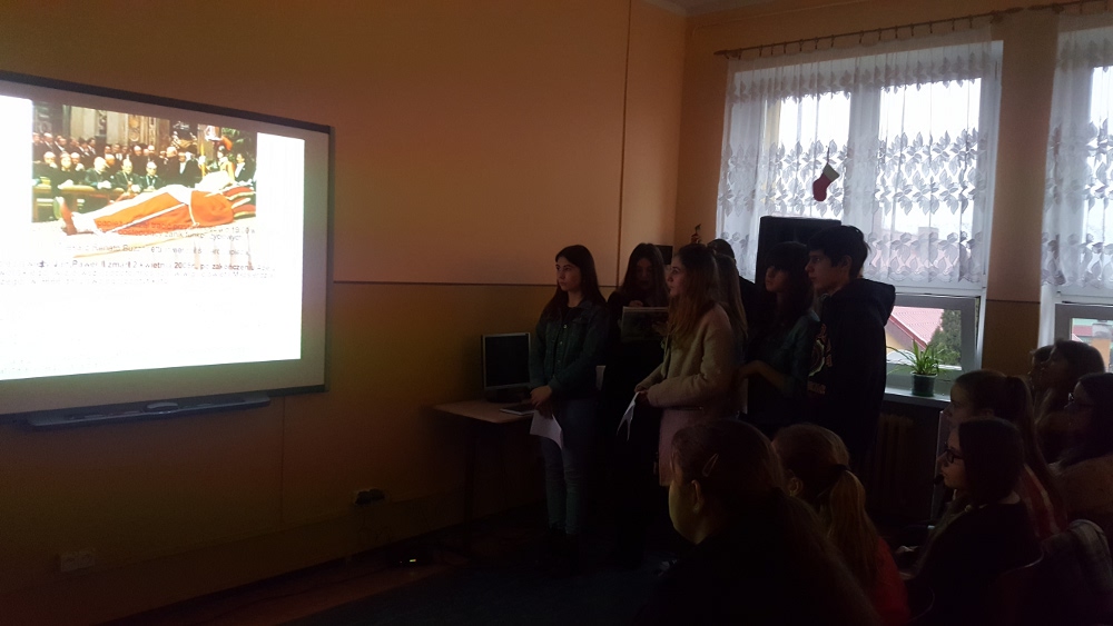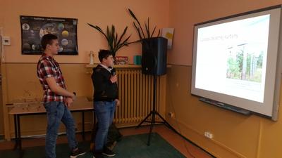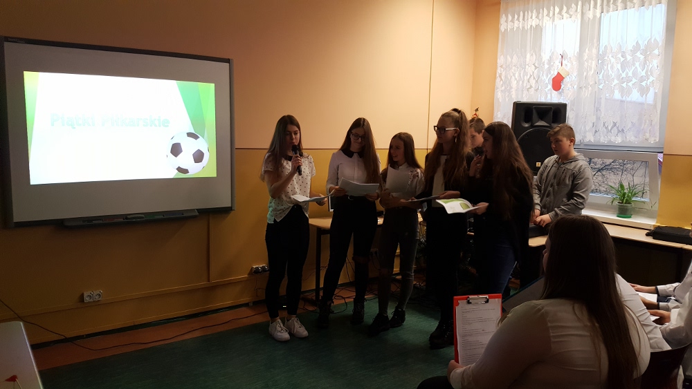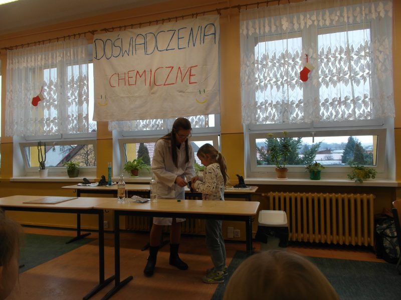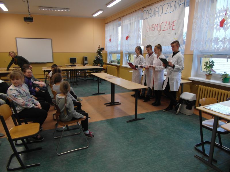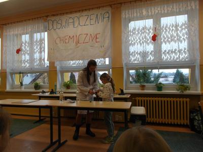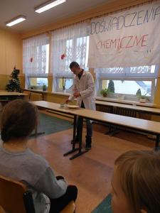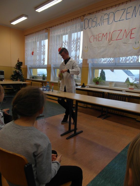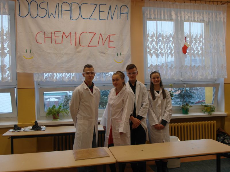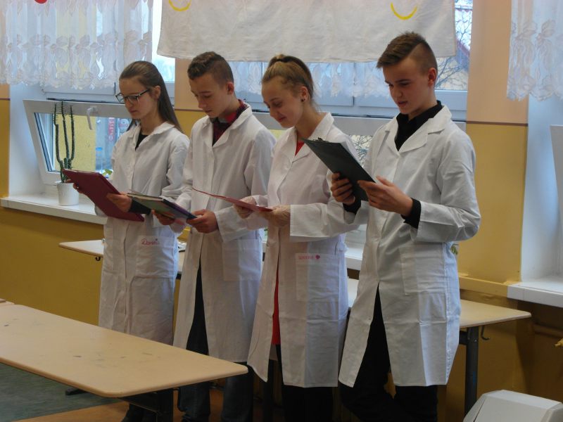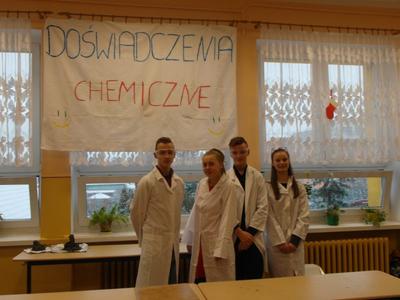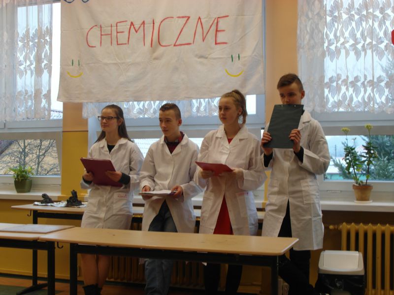 W dniu 17 stycznia grupa uczniów klasy II a - Wiktoria, Ula, Kacper oraz Łukasz - przedstawiła realizację projektu gimnazjalnego pt.: "Chemia jest słodka...". Na początku uzasadnili wybór tematu oraz korzyści z pracy nad projektem. Usłyszeliśmy m.in. "wybraliśmy ten temat projektu ponieważ: zainteresował nas temat projektu, chcieliśmy poznać laboratorium od "kuchni", chcieliśmy odkryć tajemnice jakie kryje przed nami chemia, chcieliśmy dobrze się bawić przy tworzeniu projektu. W rzeczywistości wszystko okazało się o wiele trudniejsze niż mogliśmy się spodziewać. Doświadczenia niosły ze sobą ryzyko, które nauczyło nas zachowywać stuprocentowe bezpieczeństwo podczas ich wykonywania oraz współpracy w grupie. Teraz już wiemy, że bez przyjaciół i dobrej współpracy nic nie wyjdzie."