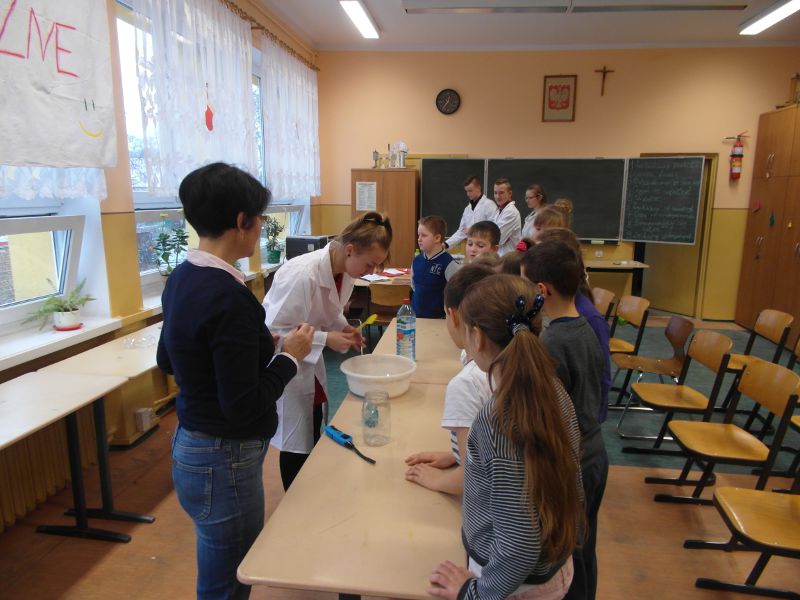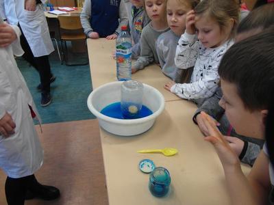 Następnie uczniowie zaprezentowali uczniom klasy III b SP 10 doświadczeń. Niektóre z nich można zobaczyć na poniższych zdjęciach.
