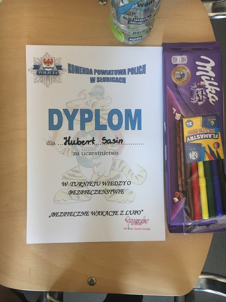 Dnia 25.05.2018r. w Komendzie Powiatowej Policji w Słubicach odbył się Powiatowy Turniej Wiedzy o Bezpieczeństwie „Bezpieczne Wakacje z Lupo". Celem Turnieju jest ograniczenie przestępczości oraz zjawisk patologicznych wśród dzieci i młodzieży. W turnieju udział wzięło łącznie 12 uczniów klas V - VI szkół podstawowych z powiatu słubickiego. Uczestnicy wykazali się ogromną wiedzą z zakresu bezpieczeństwa w ruchu drogowym, szkodliwości patologii społecznych, zapobiegania przemocy i przestępczości oraz pierwszej pomocy przedmedycznej. Szkołę Podstawową im. Wł. Broniewskiego w Górzycy reprezentował uczeń kl. V – Hubert Sasin.