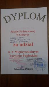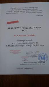 Uczniowie Oliwia Misiak-Grzyb, Nicolle Matuk i Krystian Burzyński w dniu 27 listopada reprezentowali naszą szkołę w X Międzyszkolnym Turnieju Papieskim, organizowanym przez Zespół Edukacyjny nr 9 w Zielonej Górze oraz Katolickie Stowarzyszenie "Cavitas Christiana". Nasza drużyna zajęła I miejsce!