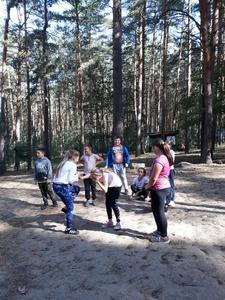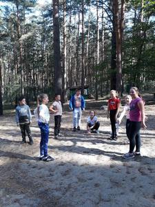 Dnia 21.09.2019r. wybraliśmy się na wycieczkę rowerową. Pojechaliśmy do Żabic nad Jezioro Żabiniec. Jechaliśmy tam z naszą wychowawczynią, towarzyszyły nam dwie mamy. Wyjechaliśmy o godzinie 9:00, a byliśmy na wigwamie około 10:00. Gdy dotarliśmy do celu czekało na nas ognisko w którym piekliśmy kiełbaski. Później bawiliśmy się w sardynki, graliśmy też w chowanego i szukaliśmy butelki z cukierkami, a także piekliśmy pianki. Było tak „superalnie”, że nikt z nas nie chciał jechać z powrotem. Czy znaleźliśmy jesień? – zastanawiamy się do dziś.