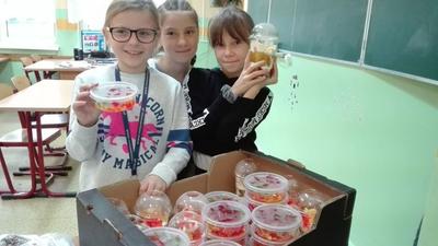 Nasza 5b to eksperci kulinarni dobrze wiedzą jak zdrowo się odżywiać i serwują swoim kolegom zdrowe przekąski zdrowe sałatki owocowe, koktajle lub galaretki kolorowe, a do tego wymyślają super rymowanki...