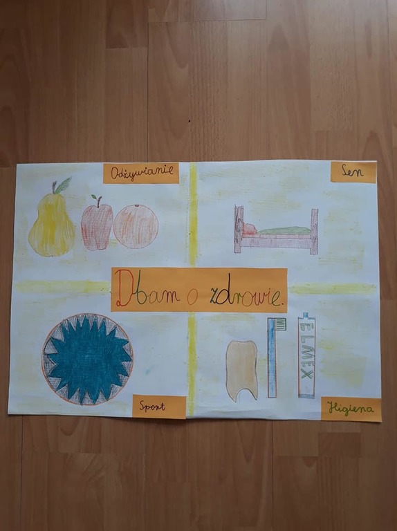 Uczniom nie obcy jest temat zdrowia. Doskonale o siebie dbają, gimnastykują codziennie, zdrowo odżywiają się, a przy tym doskonale bawiąc - uczą się. Samodzielnie, pod okiem wspaniałych rodziców, wykonali plakaty pt. ”Zdrowie ponad wszystko”. Technika pracy była dowolna, a uczniowie wykazali się ogromną kreatywnością.
