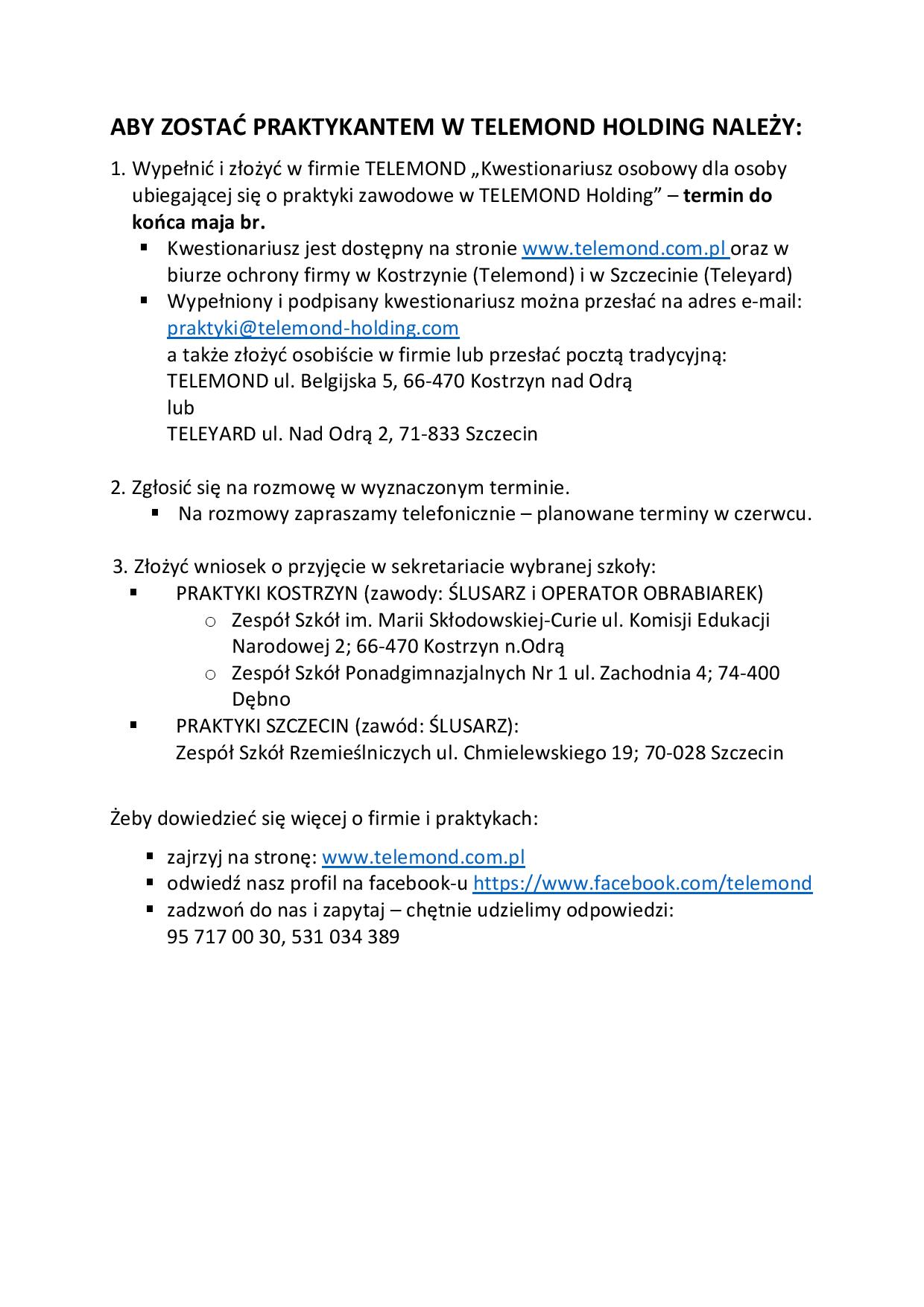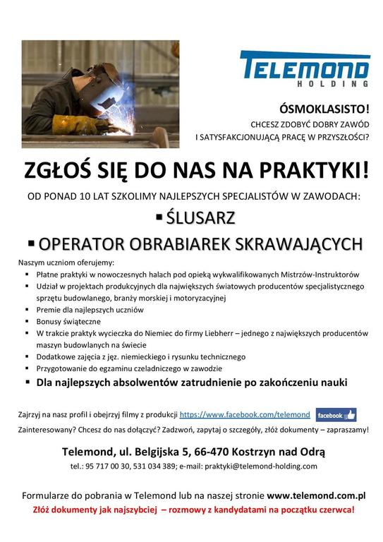 TELEMOND - PRAKTYKI W ZAWODZIE ŚLUSARZ I OPERATOR OBRABIAREK SKRAWAJĄCYCH - INFORMACJE DLA KLASY 8 Jak zostać praktykantem w firmie TELEMOND? zapoznaj się z informacjami umieszczonymi w załącznikach. Galeria zdjęć Załączniki Jak zostać praktykantem? [210.63 kB] Formularz zgłoszeniowy [138.73 kB] Powiązane wiadomości TAK PRZYGOTOWUJĄ SIĘ UCZNIOWIE KLASY 4 DO EGZAMINU... PLASTYKA PODCZAS NAUCZANIA ZDALNEGO - PRACE UCZNIÓW UNIWERSYTECKIE LICEUM OGÓLNOKSZTAŁCĄCE W SŁUBICACH... TELEMOND - PRAKTYKI W ZAWODZIE ŚLUSARZ I OPERATOR... SZANOWNI RODZICE DZIECI W WIEKU PRZEDSZKOLNYM! SZANOWNI RODZICE UCZNIÓW KL. I-III!!! Drukuj Udostępnij Data dodania: 13.05.2020 Wyświetlono: 159 Aktualności