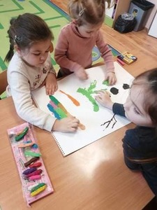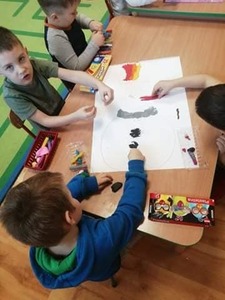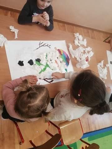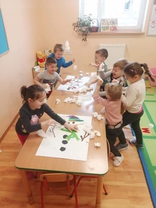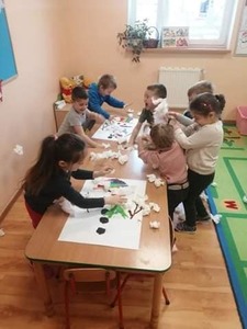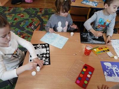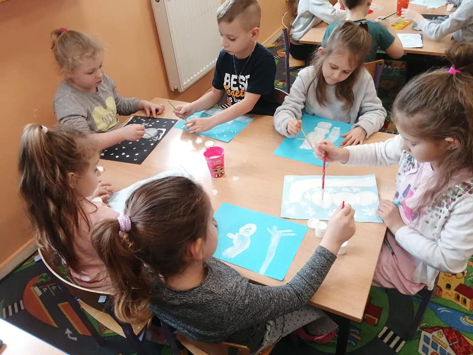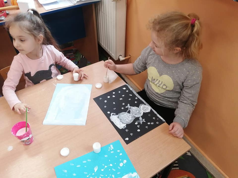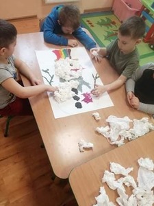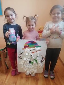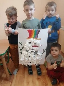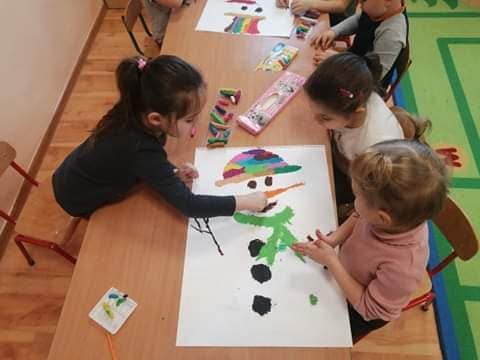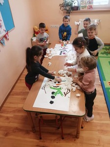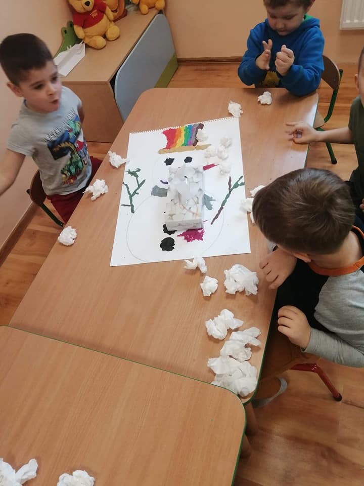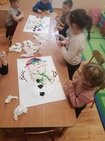 A w oddziale przedszkolnym, dzieci wyklejały bałwanki z plasteliny oraz chusteczek. Podczas pracy grupowej nie zabrakło bitwy na śnieżki