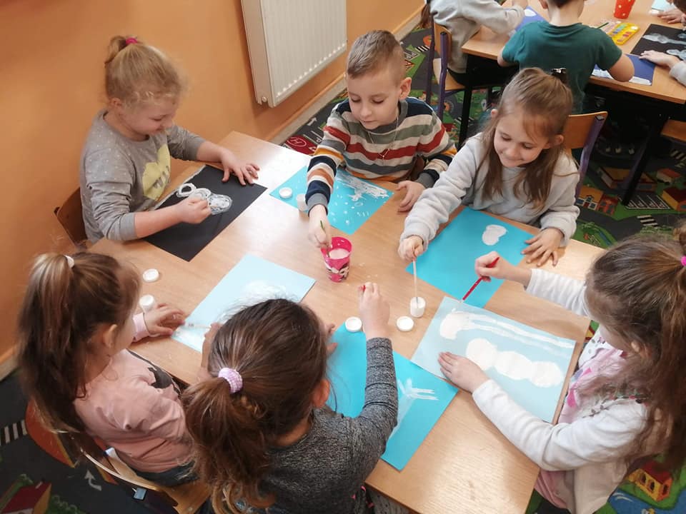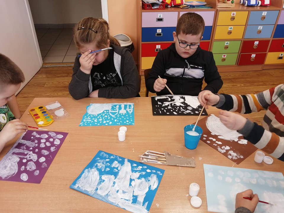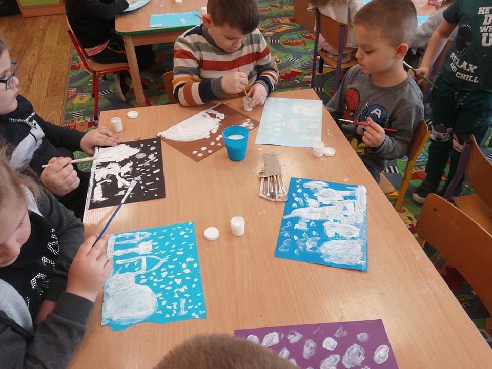 ,, Zima, zima, zima, pada, pada, śnieg...,, Pod takim hasłem dzieci z grupy 0 i oddziału przedszkolnego wykonały prace plastyczne.