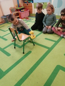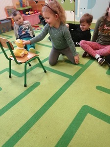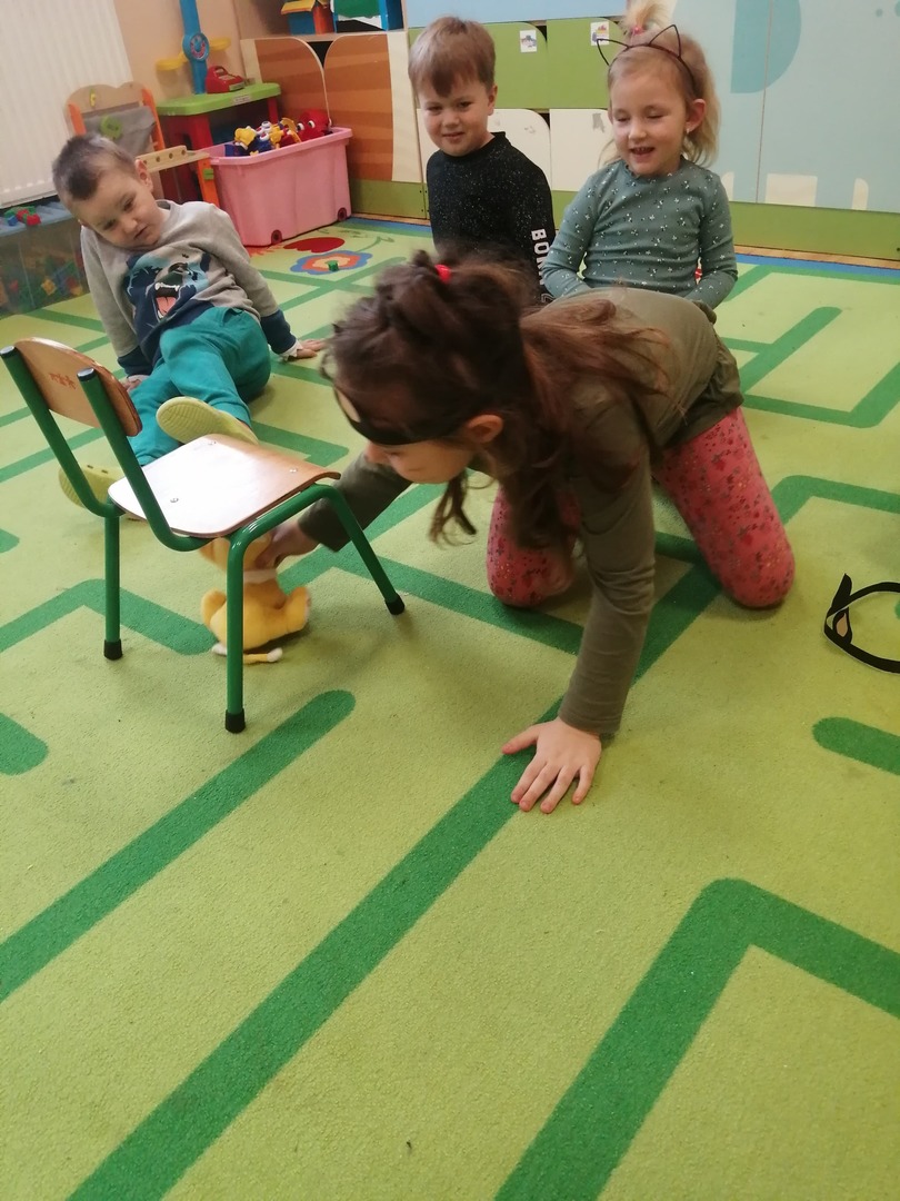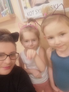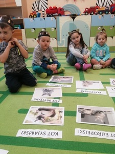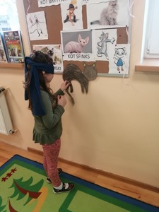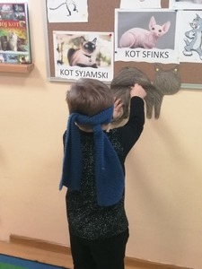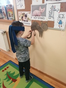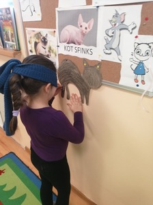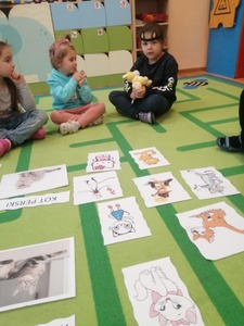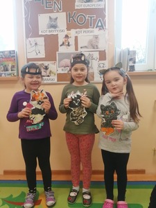 Na początku zajęć dzieci wysłuchały historii powstania święta. Oglądały obrazki przedstawiające różne rasy kotów, dowiadując się przy tym wiele ciekawych rzeczy. Nie zabrakło rozmów o naszych bajkowych kotach, które dzieci tak uwielbiają. Były też wesołe kocie zabawy: Koci spacerek, Koci masarzyk, Gdzie ukrył się kot?, Doczepianie oganka dla kotka.