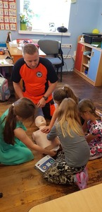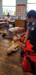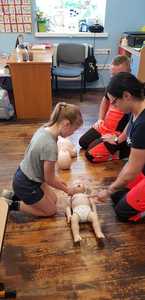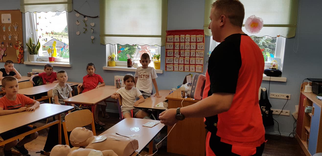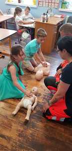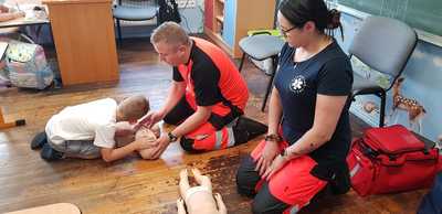 Spotkanie rozpoczęło się od pogadanki odnośnie udzielania pierwszej pomocy. Następnie każdy z uczniów miał możliwość sprawdzenia swoich sił na fantomie, pozwalającemu na naukę przeprowadzenia podstawowych czynności ratowniczych.