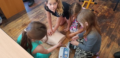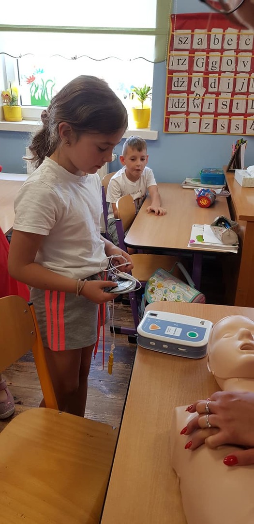 Dzieci poznały również wyposażenie torby medycznej. Najbardziej interesującym sprzętem okazał się AED- automatyczny defibrylator zewnętrzny, który zwiększa uratowanie życia aż o 70 %! Pierwszaki sprawdzały, jak działa to urządzenie.