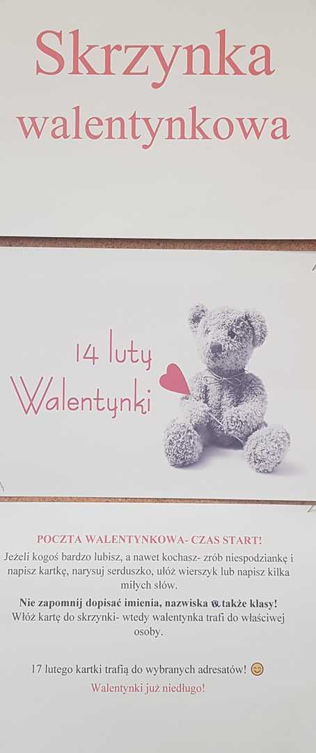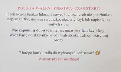 Walentynkowa akcja w małej szkole Uwaga! Mała szkoła! Walentynkowa poczta -> czas start! Galeria zdjęć Powiązane wiadomości Dożywianie w lutym Temat: Bezpieczne ferie! Dzień Piżamy Walentynkowa akcja w małej szkole Podziękowanie Uwaga, rekrutacja! Drukuj Udostępnij Data dodania: 26.01.2023 Wyświetlono: 126 Aktualności
