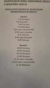 Harmonogram rozwozów w dniu rozpoczęcia roku szkolnego dn. 04.09.2023 r. Galeria zdjęć Załączniki rozowy rozpoczęcie 4 września [80.58 kB] Powiązane wiadomości Uroczyste zakończenie roku szkolnego 2022/2023 Uwaga, ogłoszenie! Rodzice dzieci oddziałów przedszkolnych! Uroczyste rozpoczęcie roku szkolnego 2023/2024... Harmonogram rozwozów w dniu rozpoczęcia roku szkolnego... Aktualne dowozy i rozwozy uczniów od dn. 05.09.2023... Uwaga, zebrania z rodzicami! Drukuj Udostępnij Data dodania: 01.09.2023 Wyświetlono: 96 Aktualności