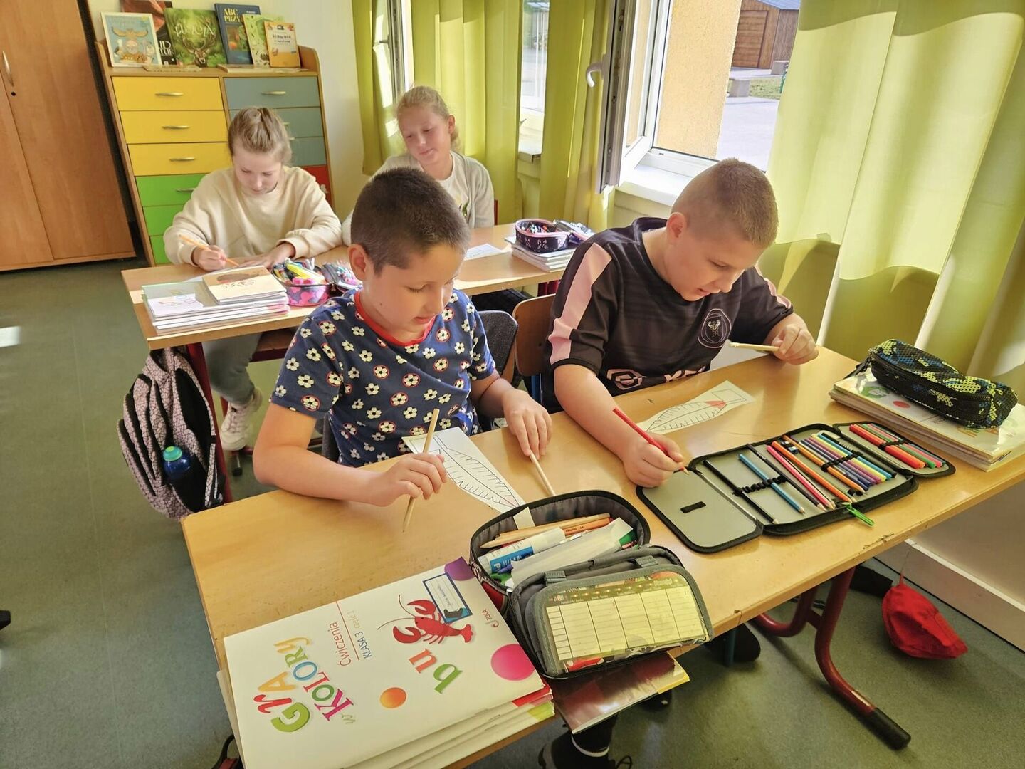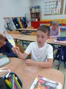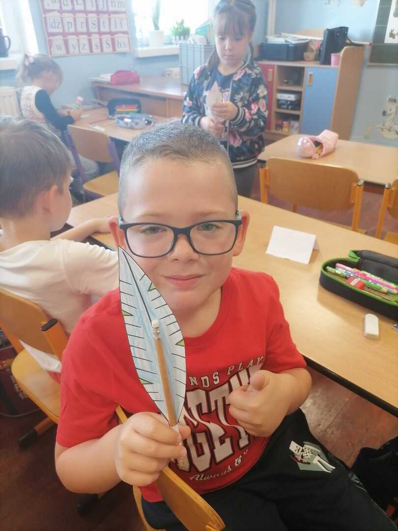 Na zakończenie czekała nas ciekawa praca plastyczno- techniczna z pięknymi, kolorowymi piórami. Dzieci otrzymały w prezencie oryginalne ołówki, a odwdzięczyły się szczerym, dziecięcym uśmiechem!