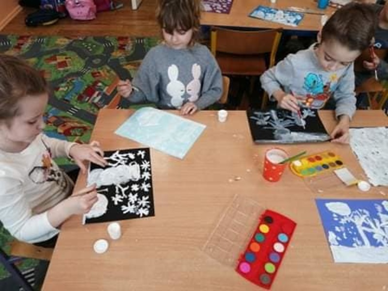 ,, Zima, zima, zima, pada, pada, śnieg...,, Pod takim hasłem dzieci z grupy 0 i oddziału przedszkolnego wykonały prace plastyczne.